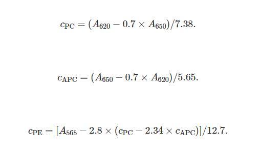 式中,A620、A650和A565分別表示620、650和565 nm處的吸光值,cPC、cAPC和cPE分別表示PC、APC和PE的濃度(mg·mL–1)。