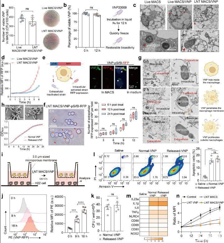 圖2、胞內(nèi)VNP菌株可由LNT MACS/VNP細(xì)胞釋放并保持其原有的生物活性。a,,活MACS/VNP和LNT MACS/VNP細(xì)胞的細(xì)胞內(nèi)活株數(shù)量的變化(左)(n=5)。顯示了代表性的涂層板(右)。b,液氮冷處理12小時(shí)后VNP菌株的存活率(n=5)。冷凍休克處理前后應(yīng)變活性變化示意圖(右)。c,使用透射電子顯微鏡(TEM)觀察不同細(xì)胞的形態(tài)。紅色箭頭表示細(xì)胞內(nèi)菌株。比例尺=5μm(正常視野)和1μm(放大視野)。d,實(shí)時(shí)監(jiān)測(cè)Live MACS/VNP-RFP和LNT MACS/VNP-RFP細(xì)胞培養(yǎng)板的RFP熒光強(qiáng)度變化(n=3)。e,使用VNP-pSifB-RFP(紅色熒光蛋白,RFP)通過(guò)MACS檢查細(xì)菌釋放的示意圖(左)。由于pSifB啟動(dòng)子,VNP-pSifB-RFP菌株僅在細(xì)胞內(nèi)被激活并表達(dá)RFP。MACS或LB培養(yǎng)基中VNP-psifB-RFP菌株的熒光場(chǎng)圖片(右)。激活的VNP-psifB-RFP菌株(紅色);沙門氏菌特異性抗體標(biāo)記VNP(綠色);DAPI標(biāo)記細(xì)胞核(藍(lán)色)。比例尺=5μm。f,從LNT MACS/VNP-pSifB-RFP細(xì)胞釋放細(xì)胞內(nèi)VNP-pSifB-RFP菌株的明場(chǎng)圖片(左)。赫斯特標(biāo)記細(xì)胞核(藍(lán)色)。橙色箭頭表示細(xì)胞內(nèi)菌株,紅色箭頭表示細(xì)胞外菌株。將細(xì)胞培養(yǎng)在補(bǔ)充有痕量慶大霉素的培養(yǎng)基中。比例尺=20μm。從三個(gè)液氮處理時(shí)間組(處理后6/12/24小時(shí))的不同時(shí)間點(diǎn)隨機(jī)選擇5個(gè)視野來(lái)計(jì)數(shù)胞外表達(dá)RFP的細(xì)菌(右)。g,借助TEM觀察LNT MACS/VNP細(xì)胞中細(xì)胞內(nèi)VNP菌株的釋放(左)。白色曲線顯示應(yīng)變從細(xì)胞內(nèi)到細(xì)胞外的運(yùn)動(dòng)。橙色箭頭表示LNT MACS細(xì)胞表面的凹口,這可能是由細(xì)胞內(nèi)應(yīng)變運(yùn)動(dòng)引起的。藍(lán)色箭頭表示細(xì)胞外增殖的細(xì)菌。比例尺=1μm(正常視野)和500 nm(放大視野)。細(xì)胞內(nèi)應(yīng)變釋放示意圖(右)。h,正常VNP和LNT MACS釋放的VNP在37°C LB液體培養(yǎng)基中的細(xì)菌形態(tài)(頂部)和生長(zhǎng)曲線(底部)(n=3)。i使用3.0μm Transwell小室間接共培養(yǎng)LNT MACS/VNP細(xì)胞與H22腫瘤細(xì)胞的示意圖。細(xì)菌可以穿過(guò)這種孔徑的室。j(i)中H22腫瘤細(xì)胞共培養(yǎng)不同時(shí)間后的相對(duì)平均熒光強(qiáng)度(MFI)比較。k H22細(xì)胞以100 MOI的不同VNP感染1小時(shí),并通過(guò)將細(xì)胞裂解物鋪在LB固體板上來(lái)確定內(nèi)化VNP的數(shù)量(n=5)。l H22細(xì)胞與不同菌株以MOI為100孵育4小時(shí)后,對(duì)Annexin V和碘化丙啶(PI)染色進(jìn)行代表性FACS分析,凋亡細(xì)胞(Annexin V+細(xì)胞)百分比的定量分析顯示在右邊(n=4)。m不同菌株與M0型巨噬細(xì)胞共培養(yǎng)6小時(shí)后,通過(guò)實(shí)時(shí)PCR檢測(cè)抗腫瘤M1型巨噬細(xì)胞相關(guān)基因的表達(dá)水平。n與LNT VNP、LNT MACS或LNT MACS/VNP孵育或不孵育后H22腫瘤細(xì)胞的增殖。細(xì)胞核染料Hoechst用于檢測(cè)細(xì)胞數(shù)量的變化。