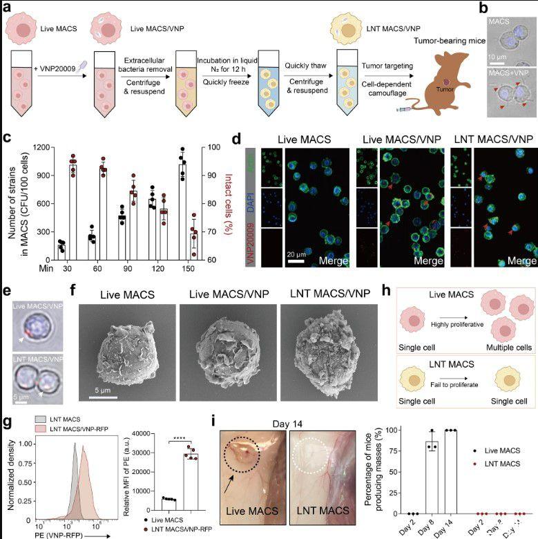 圖1、裝載VNP菌株的冷凍休克巨噬細(xì)胞的制備和表征。a)LNT MACS/VNP細(xì)胞制備過(guò)程示意圖。b)與VNP菌株(MACS+VNP)共培養(yǎng)的巨噬細(xì)胞(MACS)的明場(chǎng)圖片。赫斯特標(biāo)記細(xì)胞核(藍(lán)色)。紅色箭頭表示VNP菌株。比例尺=10μm。c)隨著細(xì)胞與菌株共培養(yǎng)的時(shí)間,MACS中細(xì)胞內(nèi)加載的活VNP菌株的數(shù)量以及形態(tài)完整的MACS的百分比發(fā)生變化(n=5)。d)Live MACS、Live MACS/VNP細(xì)胞和LNT MACS/VNP細(xì)胞的熒光圖像。FITC-鬼筆環(huán)肽標(biāo)記肌動(dòng)蛋白(綠色);DAPI標(biāo)記細(xì)胞核(藍(lán)色)。紅色箭頭表示細(xì)胞內(nèi)VNP-RFP菌株。比例尺=20μm。e)活MACS/VNP和LNT MACS/VNP細(xì)胞的明場(chǎng)圖片。赫斯特標(biāo)記細(xì)胞核(藍(lán)色)。白色箭頭表示VNP菌株(表達(dá)紅色熒光蛋白的菌株)。比例尺=5μm。f)使用掃描電子顯微鏡(SEM)觀察不同細(xì)胞的形態(tài)。比例尺=5μm。g)顯示了LNT MACS和LNT MACS/VNP-RFP的相對(duì)平均熒光強(qiáng)度(MFI)。au,任意單位。h)Live MACS和LNT MACS增殖活性比較示意圖。i)Live MACS和LNT MACS的體內(nèi)增殖活性比較(右)。百分比值總結(jié)自三個(gè)獨(dú)立實(shí)驗(yàn)(每個(gè)獨(dú)立實(shí)驗(yàn)每組n=5只小鼠)。顯示了質(zhì)量生成的代表性解剖學(xué)觀察圖像(左)。