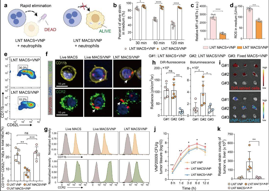 圖3、LNT MACS保護(hù)VNP菌株免遭清除并促進(jìn)其在腫瘤中的積累。a LNT MACS/VNP細(xì)胞偽裝胞內(nèi)菌株以逃避中性粒細(xì)胞介導(dǎo)的細(xì)菌清除的示意圖。b原代腹膜中性粒細(xì)胞與LNT MACS+VNP和LNT MACS/VNP共培養(yǎng)不同時(shí)間后培養(yǎng)基中活菌株百分比的變化。c、d比較(b)中不同處理后60分鐘培養(yǎng)基中中性粒細(xì)胞產(chǎn)生的NET和ROS水平。e不同處理后1小時(shí)外周血中性粒細(xì)胞總數(shù)中活化中性粒細(xì)胞(CD11b高CD62L低)百分比變化的代表性流式細(xì)胞圖(上)和條形比較圖(下)(n=5)。f通過(guò)共聚焦顯微鏡分析Live MACS、Live MACS/VNP和LNT MACS/VNP細(xì)胞中的CD11b和CCR2表達(dá)。白色箭頭表示細(xì)胞內(nèi)菌株。比例尺=10μm。g不同細(xì)胞中CD11b和CCR2的代表性流式細(xì)胞術(shù)。h顯示指定組腫瘤的熒光和生物發(fā)光強(qiáng)度(n=5)。使用DiR標(biāo)記的細(xì)胞和VNP-LuxCDABE菌株。i(h)中不同處理后8小時(shí)分離的腫瘤的熒光圖像。j注射后時(shí)間與腫瘤內(nèi)細(xì)菌數(shù)量之間的關(guān)系(n=4或5)。k根據(jù)第6天提取的器官回收的CFU計(jì)算每克細(xì)菌CFU的腫瘤與肝臟比率(n=5)