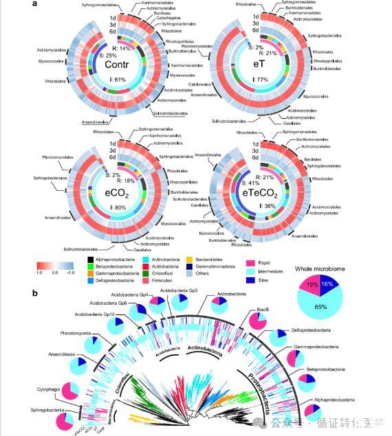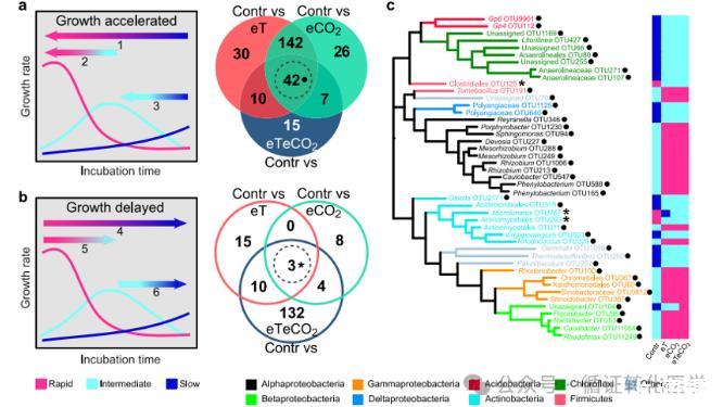 在生長(zhǎng)策略發(fā)生變化的群系中,共有45個(gè)OTUs在三種處理比較中共享(即,對(duì)照vs eT,對(duì)照vs eCO2,對(duì)照vs eTeCO2),其中包括42個(gè)“生長(zhǎng)加速”的OTUs和3個(gè)“生長(zhǎng)延遲”的OTUs(圖4a,b)?;谶@些OTUs的可視化的系統(tǒng)發(fā)育分布(圖4c),42個(gè)一致“生長(zhǎng)加速”的OTUs顯示了一個(gè)廣泛分布于八個(gè)主要門(mén)的情況。大多數(shù)與α-變形菌門(mén)、β-變形菌門(mén)和γ-變形菌門(mén)相關(guān)的OTUs將其策略從“中間”轉(zhuǎn)變?yōu)椤翱焖佟?。在適應(yīng)氣候變化后,與δ-變形菌門(mén)、放線菌門(mén)、綠彎菌門(mén)和酸桿菌門(mén)相關(guān)的OTUs主要將其策略從“慢速”轉(zhuǎn)變?yōu)椤爸虚g”響應(yīng)。總的來(lái)說(shuō),適應(yīng)氣候變化通過(guò)物種組成及其響應(yīng)策略的轉(zhuǎn)變重塑了微生物生長(zhǎng)模式,最終影響了系統(tǒng)發(fā)育模式。