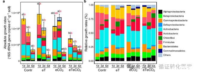 eT中的細(xì)菌群落豐富度最低,而升高的eCO2濃度相比對(duì)照組(Contr)增加了α多樣性(p<0.05)。盡管門(mén)水平的群落組成相似,但氣候變化處理之間OTU的豐度明顯分離。因此,土壤微生物群落在小麥-水稻輪作系統(tǒng)中已經(jīng)改變并對(duì)十年的變暖和二氧化碳濃度升高產(chǎn)生了適應(yīng)??偣玻?017個(gè)OTU被鑒定為18O“吸收者”(增長(zhǎng)率顯著高于零的OTU),并用于后續(xù)的增長(zhǎng)評(píng)估。整個(gè)群落的累積增長(zhǎng)率在每個(gè)三段培養(yǎng)期(0-1,0-3和0-6天培養(yǎng),圖2)內(nèi)計(jì)算,濕潤(rùn)后的持續(xù)時(shí)間和氣候都影響了微生物的增長(zhǎng)率,在濕潤(rùn)后的6天培養(yǎng)期內(nèi),所有四種氣候變化情景下的群落層面增長(zhǎng)率在第一天達(dá)到峰值(在eCO2處理中,0-1天和0-3天的培養(yǎng)之間沒(méi)有顯著差異)。隨著時(shí)間推移,增長(zhǎng)率逐漸下降,在Contr、eT、eCO2和eTeCO2土壤中相對(duì)于第一天的6天培養(yǎng)期內(nèi)分別下降了73%、87%、75%和50%。在四種氣候條件下,eT和eCO2下的峰值群落層面增長(zhǎng)率保持與對(duì)照組相當(dāng)?shù)乃?,但在eTeCO2中下降了47%(p<0.05)。