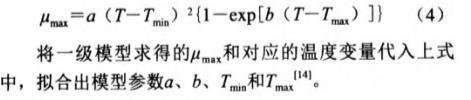 采用Ratkowsky模型(公式(4))對一級模型所獲得的最大生長速率(μmax)進(jìn)行二級模型的建立。采用Microsoft Excel中的規(guī)劃求解進(jìn)行二級模型的建立。