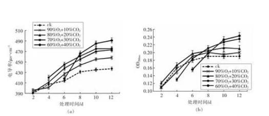 隨著處理時間的延長,各處理枝孢菌的電導率均呈上升趨勢(圖4a)。ck處理初期增速較快,8 d后趨于平穩(wěn);70%O2+30%CO2、80%O2+20%CO2和90%O2+10%CO2處理在10 d后達到平衡;而60%O2+40%CO2處理初期迅速增加,10 d后仍未進入穩(wěn)定期,表明高CO2對枝孢菌的細胞膜通透性造成了嚴重的破壞。就整體而言,各處理組電導率隨CO2濃度的升高而增大。
