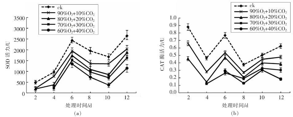 2.6 O2/CO2主動自發(fā)氣調(diào)對SOD和CAT活性的影響