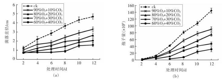 隨著處理時間的延長,各處理的菌落直徑與孢子量均呈上升趨勢,而10 d后增長趨勢有所減緩(圖3)。孢子生成速率與菌落擴展速率隨CO2濃度的升高而降低,70%O2+30%CO2和60%O2+40%CO2處理分別在4 d和6 d時菌落才開始擴展并出現(xiàn)孢子,10 d后增長速率趨于平緩。12 d時ck、90%O2+10%CO2、80%O2+20%CO270%O2+30%CO2和60%O2+40%CO2處理的孢子量和菌落直徑分別為145.03×106,89.99×106,74.68×106,47.63×106,31.37×106個和4.68,3.29,2.63,2.05,1.58 cm,且差異均達到顯著水平(P<0.05)。