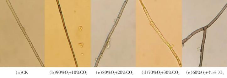 不同O2/CO2主動自發(fā)氣調(diào)對枝孢菌微觀結構產(chǎn)生不同影響(圖2)。CK處理菌絲粗細均勻,表面光滑;90%O2+10%CO2處理菌絲表面平整,而菌絲內(nèi)出現(xiàn)隔膜;80%O2+20%CO2處理菌絲內(nèi)部出現(xiàn)隔膜以及空腔;70%O2+30%CO2處理菌絲表面凹凸不平,且隔膜處菌絲膨脹,中空嚴重;60%O2+40%CO2處理菌絲表面粗糙,菌絲出現(xiàn)分支,內(nèi)部隔膜與空腔增多。