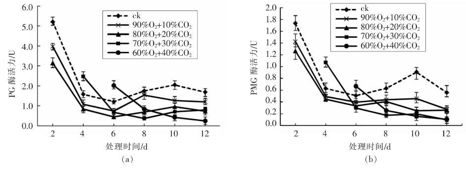 在整個處理過程中,PG和PMG活性基本呈下降趨勢,且隨CO2濃度的增加而降低(圖7)。整個貯藏期間,ck、90%O2+10%CO2、80%O2+20%CO2、70%O2+30%CO2和60%O2+40%CO2處理的PG和PMG的平均活性分別為2.25,1.64,1.13,1.01,0.88 U和0.83,0.58,0.49,0.37,0.30 U,表明高CO2可以抑制PG和PMG的活性,降低枝孢菌的致病性。