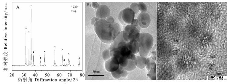 圖1納米ZnO-Ag復(fù)合材料的XRD衍射花樣(A)、TEM圖(B)和HRTEM圖(C)