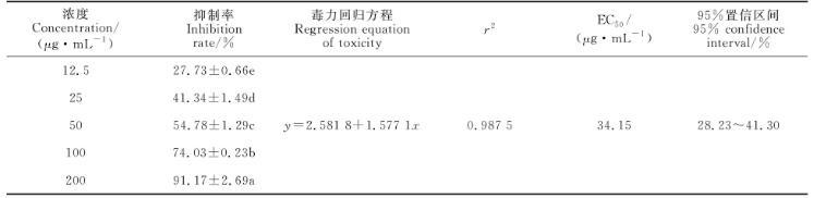 由表1可知,納米ZnO-Ag復(fù)合材料能夠抑制小麥根腐菌菌絲的生長,菌絲生長抑制率隨材料濃度的升高而增大,200μg·mL-1ZnO-Ag對病菌菌絲生長抑制率高達(dá)91.17%;不同濃度復(fù)合材料處理的病菌菌絲生長抑制率間差異均顯著(P<0.05)。納米ZnO-Ag對病菌的毒力回歸方程為y=2.581 8+1.577 1x,EC50=34.15μg·mL-1,說明ZnO-Ag復(fù)合材料對小麥根腐病菌的抑制作用較強(qiáng)。