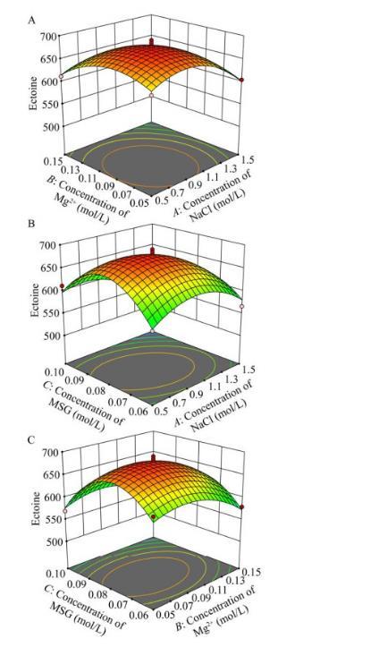 使用Design-Expert v.11.0繪制3D Surface響應面模型圖,分析不同因素的交互作用影響ectoine積聚量(圖4)。綜合分析顯示,不同兩因素交互作用條件下,ectoine的積聚量均呈先升高后降低的變化趨勢,峰值不同。NaCl和Mg2+交互作用分析表明(圖4A):當0.08 mol/L MSG濃度時,最高峰值條件為1.0 mol/L NaCl和0.1 mol/L Mg2+。NaCl和MSG交互作用分析表明(圖4B):當0.1 mol/L Mg2+濃度時,最高峰值條件為0.08 mol/L MSG和1.0 mol/L NaCl。Mg2+和MSG交互作用分析表明(圖4C):當1.0 mol/L NaCl濃度時,最高峰值條件為0.1 mol/L Mg2+和0.08 mol/L MSG。使用最優(yōu)發(fā)酵條件組合(NaCl 1.25 mol/L,Mg2+0.09 mol/L,MSG 0.08 mol/L)進行3次重復實驗,檢測ectoine積聚量(均值696.313 mg/L),與預測值(701.436 mg/L)非常接近,相對誤差小于5%,說明該驗證模型有效可行。