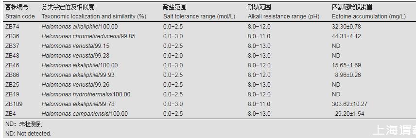 表2分離菌株耐鹽耐堿范圍和ectoine積聚量