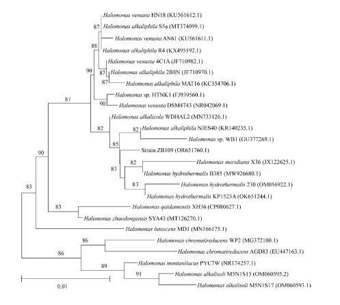 參照《常見細菌系統(tǒng)鑒定手冊》[17]和《伯杰細菌鑒定手冊》[18]進行菌株ZB109的碳氮源利用與生理生化鑒定。結果顯示:該菌株能利用精氨酸、賴氨酸、(NH4)2SO4、NH4Cl、KNO3、葡萄糖、甘露醇、肌醇、山梨醇、鼠李糖、蔗糖、蜜二糖、苦杏仁甙、阿拉伯糖、檸檬酸、淀粉和麥芽糖作為唯一碳氮源生長,不能利用鳥氨酸和乳糖,β-半乳糖苷酶(ONPG)和脲酶試驗為陽性,V-P試驗、產(chǎn)H2S試驗、吲哚試驗和明膠液化試驗均呈陰性,與鹽單胞菌菌株H.ventosae QHL5[16]、Halomonas sp.QHL25[19]和Halomonas sp.A20[20]的相關結果一致。16S rRNA基因序列比對分析顯示,菌株ZB109與H.alkaliphila(KR140235.1)的相似性最高(99.78%)。使用MEGA v.11.0軟件構建系統(tǒng)發(fā)育樹(圖2),初步確定菌株ZB109(OR651760.1)與鹽單胞菌屬菌株進化同源,分類隸屬于變形菌門(Proteobacteria)γ-變形桿菌綱(Gammaproteobacteria)海洋螺菌目(Oceanospirillales)鹽單胞菌科(Holomonadaceae)鹽單胞菌屬(Halomonas)嗜堿鹽單胞菌(H.alkaliphila)。