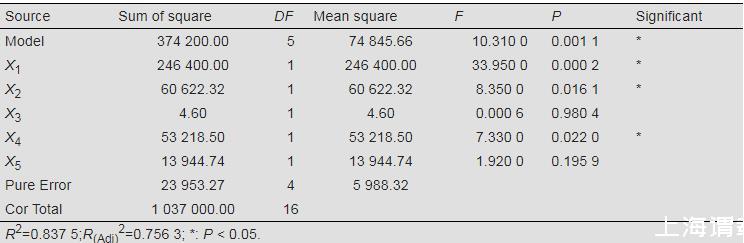 基于Plackett-Burman試驗篩選影響菌株ZB109胞內ectoine積聚量的顯著因素(表3)。結果顯示:模型方差F值為10.31,P<0.05,表明模型具有統(tǒng)計學意義。3個關鍵因子的變化顯著影響菌株ZB109的胞內ectoine積聚量(P<0.05),影響強度依次為NaCl(X1)>Mg2+(X2)>MSG濃度(X4),而Ca2+(X3)與CaCO3濃度(X5)的變化無顯著影響(P>0.05)。使用Design-Expert v.11.0軟件擬合實驗模型,建立線性回歸方程:Y=232.10?143.31X1?71.08X2?0.619 4X3+66.59X4?34.09X5,式中Y為ectoine積聚量,因素X1?X5分別為NaCl、Mg2+、Ca2+、MSG和CaCO3濃度?;貧w決定系數(shù)R2=0.837 5,模型擬合程度較好;修正決定系數(shù)R(Adj)2=0.756 3,表明75.63%的響應值變化可以通過擬合模型進行解釋。