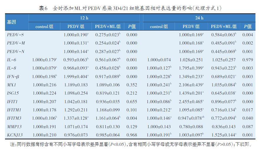 表6全時(shí)添加ML對PEDV感染3D4/21細(xì)胞基因相對表達(dá)量的影響(處理方式1)