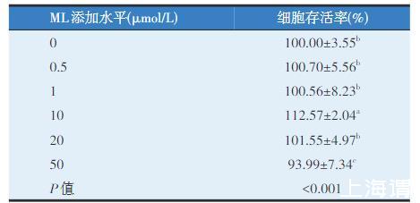 由表5可知,與control組相比,10μmol/L的ML組細(xì)胞存活率最高(P<0.05);而50μmol/L的ML組細(xì)胞存活率顯著降低(P<0.05)。