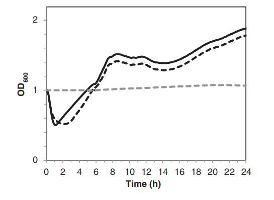 圖6??莶菅挎邨U菌孢子萌發(fā)和營養(yǎng)生長的比較:TSB中未經(jīng)處理的孢子(對照)(?),孢子在90°C的水熱處理中暴露10分鐘,然后在TSB中孵化(–),未經(jīng)處理的孢子或孢子在90°C的水熱處理中暴露10分鐘,然后在水中孵化(–)。在30°C下,通過OD600的變化測量發(fā)芽和營養(yǎng)生長。