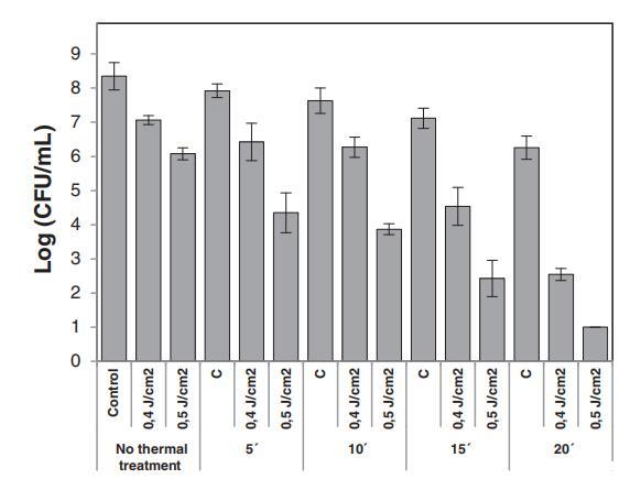 在90°C下加熱5或10分鐘(不進行PL后處理)會導(dǎo)致枯草桿菌孢子輕微失活(處理5和10分鐘的對數(shù)分別減少0.3和0.6)。如前所述,枯草芽孢桿菌的熱預(yù)處理提高了后續(xù)PL處理的抗菌作用。即使在0.4 J/cm2的注量下發(fā)現(xiàn)枯草桿菌孢子對隨后的光致發(fā)光處理有熱致敏作用,但在0.5 J/cm2的注量下更為明顯。事實上,在90°C下加熱5分鐘,然后暴露在0.4 J/cm2的通量下,導(dǎo)致枯草桿菌計數(shù)減少1.8對數(shù),而在0.5 J/cm2的通量下觀察到4對數(shù)減少。此外,當(dāng)熱預(yù)處理時間較長時,PL誘導(dǎo)枯草芽孢桿菌數(shù)量減少。在90°C下加熱5分鐘后,0.4 J/cm2的注量導(dǎo)致1.8對數(shù)減少,而在90分鐘下加熱10分鐘、15分鐘和20分鐘后,枯草桿菌計數(shù)分別減少2.1、3.7和5.7對數(shù)。PL和熱處理的組合可以使用比單獨使用熱時孢子失活所需的溫度更低或處理時間更少的溫度。這樣,在90°C下加熱20分鐘導(dǎo)致枯草芽孢桿菌計數(shù)減少約2對數(shù),而當(dāng)PL處理(0.4 J/cm2)之前進行較弱的熱處理(90°C下僅5分鐘)時,發(fā)現(xiàn)類似的減少。