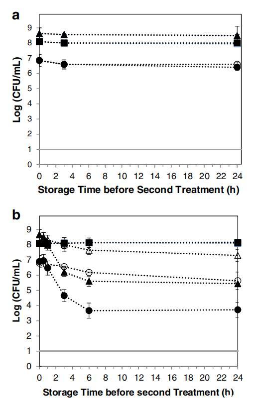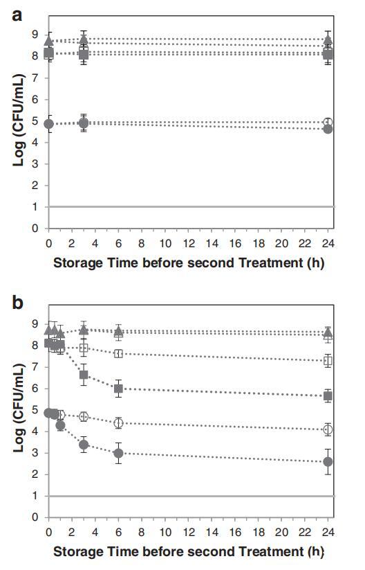 圖4。 亞致死PL預(yù)處理(0.5 J/cm2)后枯草桿菌孢子的熱敏性(90°C,10分鐘) )在30°C(填充符號)或4°C(空符號)下存儲期間 在蒸餾水(a)或營養(yǎng)培養(yǎng)基(TSB)(b)中:孢子PL預(yù)處理,但不接受后期熱處理(PL預(yù)處理對照)( ■), 孢子孵化和 進行熱處理,但之前未進行PL預(yù)處理(熱處理 控制)( ▲) 孢子PL經(jīng)過預(yù)處理和后熱處理 ( ●). 誤差線表示95%水平的置信區(qū)間。 連續(xù)線顯示 枚舉檢測級別。
