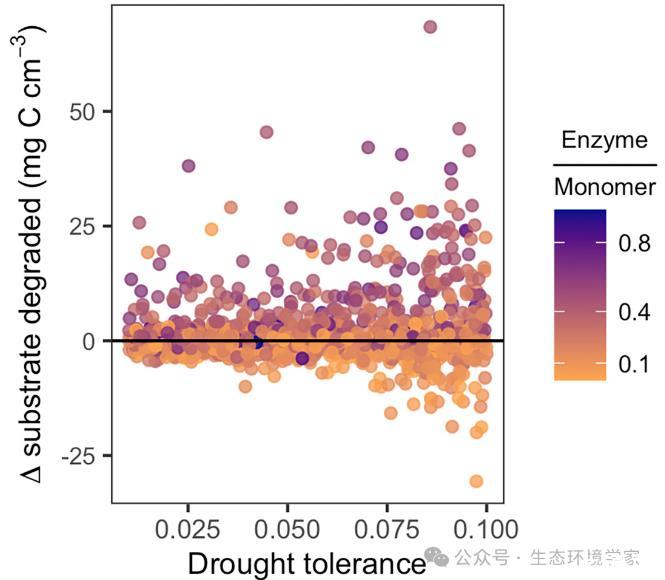 FIGURE 4|Taxon impacts on substrate degradation in relation to drought tolerance.Points are coloured by taxon-specific exo-enzyme production relative to monomer use,with lower values representing cheating strategies.Data are shown from simulations under the drought climate scenario.