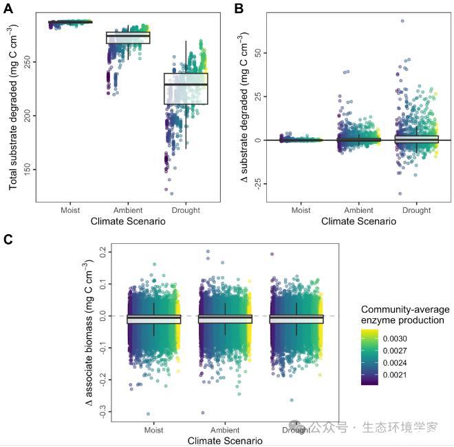 生態(tài)學(xué)的一個(gè)主要挑戰(zhàn)是理解不同物種如何相互作用來決定生態(tài)系統(tǒng)功能,特別是在具有大量共存物種的群落中。本研究使用基于性狀的微生物凋落物分解模型來量化不同類群對生態(tài)系統(tǒng)功能的影響。此外,本研究構(gòu)建了一個(gè)新穎的框架,使用DEMENT模擬器在環(huán)境、潮濕和干旱的氣候情景下進(jìn)行了微生物排除實(shí)驗(yàn),突出了分類群特征和環(huán)境條件之間的相互作用,重點(diǎn)關(guān)注它們對群落相互作用和生態(tài)系統(tǒng)功能的綜合影響。結(jié)果表明,一個(gè)類群的生態(tài)系統(tǒng)影響是由其資源獲取特征和群落功能能力驅(qū)動(dòng)的,但生理脅迫放大了正負(fù)相互作用的影響。此外,即使微生物與其他類群之間存在負(fù)的兩兩相互作用,也可能對生態(tài)系統(tǒng)功能產(chǎn)生凈的積極影響。隨著群落對全球氣候變化響應(yīng)的轉(zhuǎn)變,本研究結(jié)果揭示了從分類群特征和相互作用預(yù)測群落生物地球化學(xué)功能的潛力。