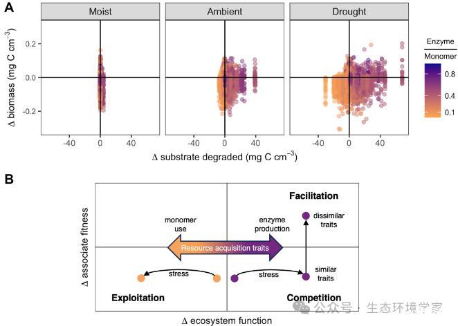 FIGURE 5|(A)Focal taxon impacts on associate biomass and substrate degradation.Points are coloured by taxon-specific exo-enzyme production relative to monomer use,with lower values representing cheating strategies.(B)A generalisable framework for predicting taxon impacts on community dynamics and ecosystem function.Traits associated with resource acquisition determine whether impacts on ecosystem function will be positive or negative,but environmental stress amplifies the impact on ecosystem function in both positive and negative directions.In our simulations,under low environmental stress,focal taxa did not have meaningful impacts on substrate degradation regardless of taxon traits.When environmental stress was high,taxa that invested in greater enzyme production had more positive impacts on resource degradation.Trait dissimilarity between the focal taxon and the associate taxa determines whether exclusion of the focal taxon will lead to positive or negative impacts on the associate's fitness(y-axis position).Analysis of our data showed that,when a focal taxon had high positive impacts on substrate degradation,similar taxa tended to have competitive interactions and dissimilar taxa tended to have facilitative interactions.Furthermore,there were very few focal taxa that had negative impacts on substrate degradation and positive impacts on associate taxa(upper left quadrant)because positive impacts on associates require higher rates of enzyme production by the focal taxon.