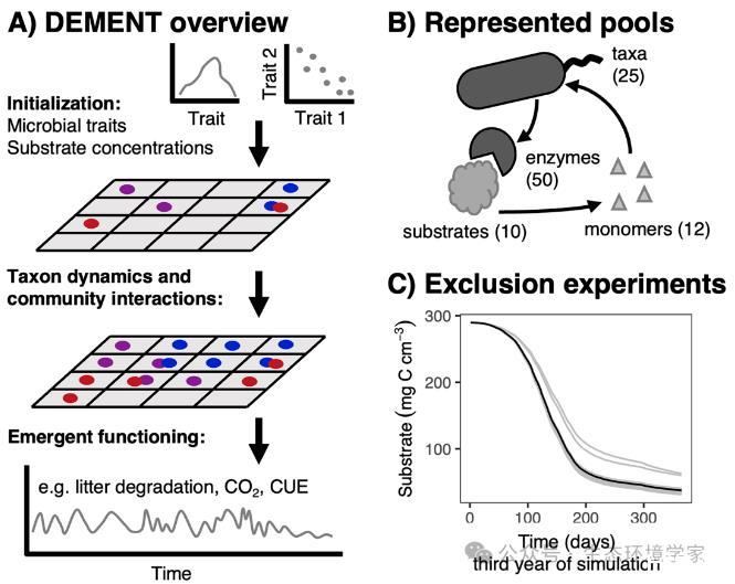 FIGURE 1|Schematic of the DEMENT model and experimental design.(A)DEMENT is spatially explicit and represents microbial traits,taxon dynamics,community interactions and emergent functioning.(B)We modelled 10 substrates,50 enzymes,12 monomers(one for each substrate as well as two pools that represent inorganic nitrogen and phosphorus)and 25 microbial taxa.(C)To quantify taxon impacts on ecosystem function,we conducted exclusion experiments in which we removed a focal taxon from the initialization.The black line indicates a simulation with all taxa present.Grey lines indicate exclusion simulations without the focal taxon.