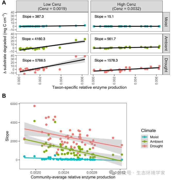 FIGURE 3|(A)The impact of a focal taxon on substrate degradation is positively related to the taxon-specific relative enzyme production,but the relationship is mediated by community-average relative enzyme production(Cenz)and climate.Points are coloured by climate scenarios.Data are shown here for representative communities with low and high Cenz,but analyses were conducted for all 50 replicate communities.The black lines represent the predicted taxon impact from a linear regression that includes taxon-specific relative enzyme production,community-average relative enzyme production,climate conditions and their interaction(p-value<0.001,R2=0.45).(B)The relationship between the impact of a focal taxon on substrate degradation and taxon-specific relative enzyme production(i.e.the slope from Panel A)is negatively related to community-average relative enzyme production and mediated by climate conditions(multiple regression:p-value<0.001,R2=0.70).