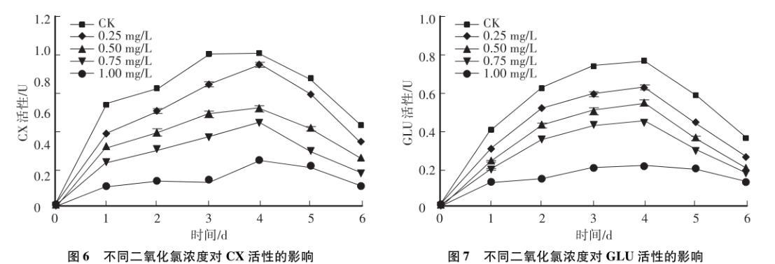 聚甲基纖維素酶、β-葡萄糖苷酶都是纖維素酶系中的一種,能夠降解纖維素,是植物病原菌所分泌的重要致病因子,在植物的致病過程中分解植物表皮細胞的纖維素,引起細胞壁損傷以及組織浸解。如圖6所示,在整個培養(yǎng)期間,CX活性呈現(xiàn)先升高后降低的趨勢,峰值在第4天,晚于PG、PMG,且活性較低,1 mgL二氧化氯組的CX活性僅為對照組的30.4%。之后,隨著二氧化氯濃度的升高,酶活性顯著(P<0.05)降低,說明二氧化氯能夠有效抑制CX活性,且與濃度呈正相關(guān)。