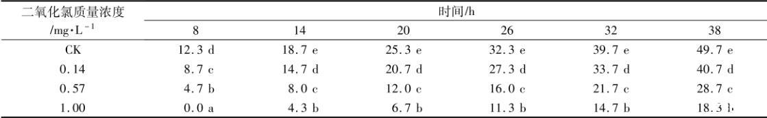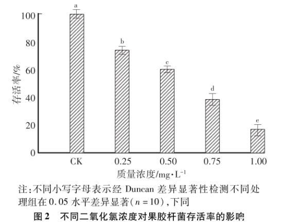 注:不同小寫字母表示經(jīng)Duncan差異顯著性檢測不同處理組在0.05水平差異顯著(n=10),下同圖2不同二氧化氯濃度對果膠桿菌存活率的影響