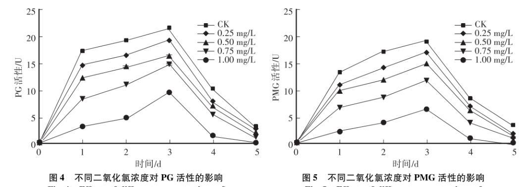 果膠酶是指分解果膠的一種多酶復合物,腐敗菌通過分泌PG破壞寄主的細胞壁結(jié)構(gòu),使其能夠吸收寄主的營養(yǎng)寄生。如圖4所示,在培養(yǎng)過程中,PG活性呈現(xiàn)先迅速升高后趨向平穩(wěn),最后下降的趨勢。3d時,各組的PG活性達到峰值,對照組最大,為21.5 U,而0.25 mgL、0.5 mgL、0.75 mgL和1.00 mgL組的果膠酶活性分別為19.3 U、16.4 U、14.9 U和9.7 U,說明二氧化氯處理能夠顯著抑制果膠桿菌產(chǎn)生的PG活性。