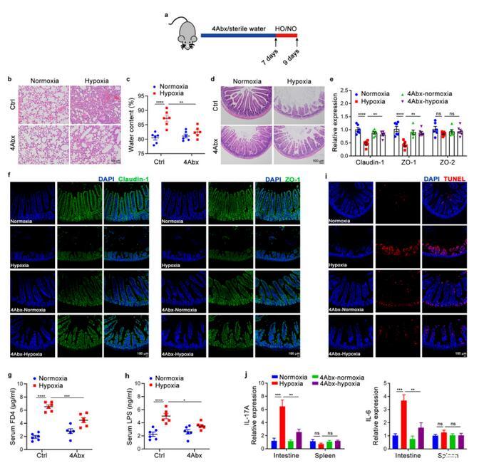 圖1:腸道微生物群的消耗可減輕缺氧引起的腸道損傷和肺水腫