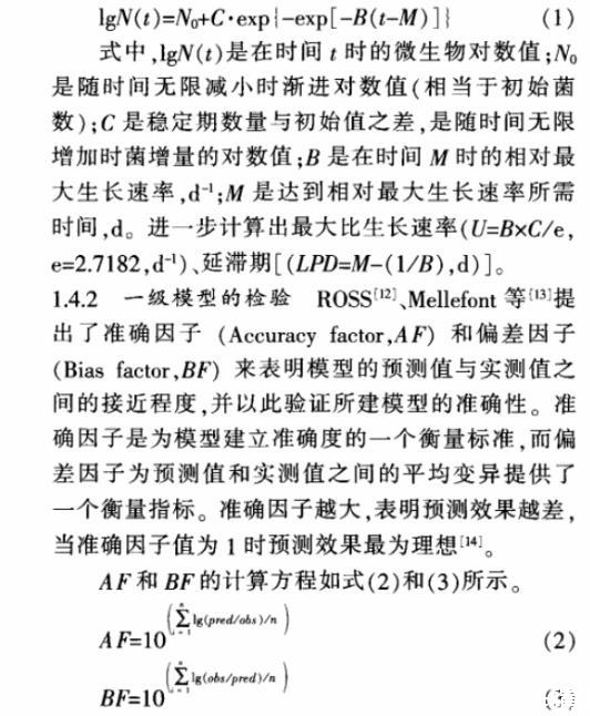1.4.2 一級(jí)模型的檢驗(yàn) ROSS、Mellefont等提出了準(zhǔn)確因子(Accuracy factor,AF)和偏差因子(Bias factor,BF)來表明模型的預(yù)測值與實(shí)測值之間的接近程度,并以此驗(yàn)證所建模型的準(zhǔn)確性。準(zhǔn)確因子是為模型建立準(zhǔn)確度的一個(gè)衡量標(biāo)準(zhǔn),而偏差因子為預(yù)測值和實(shí)測值之間的平均變異提供了一個(gè)衡量指標(biāo)。準(zhǔn)確因子越大,表明預(yù)測效果越差,當(dāng)準(zhǔn)確因子值為1時(shí)預(yù)測效果最為理想。