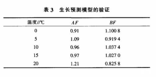 2.2.2 一級模型的檢驗(yàn) 用準(zhǔn)確因子(AF)和偏差因子(BF)來驗(yàn)證所建一級模型的準(zhǔn)確性,從表3可知,準(zhǔn)確因子和偏差因子的值均在1左右,說明模型描述有效。