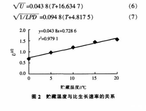 用平方根模型擬合貯藏溫度對熱死環(huán)絲菌生長的影響。圖2、圖3是用平方根模型擬合貯藏溫度與比生長速率、溫度與延滯期的關(guān)系。貯藏溫度與比生長速率的函數(shù)關(guān)系為方程(6),貯藏溫度與延滯期的函數(shù)關(guān)系為方程(7)。