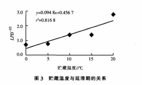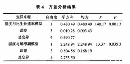 表4是模型的方差分析結(jié)果,用F統(tǒng)計量來檢驗(yàn)平方根模型的顯著性。由圖2、圖3、表4可知,此方程能較好地描述試驗(yàn)貯藏溫度范圍內(nèi)溫度與最大比生長速率、貯藏溫度與延滯期的關(guān)系。