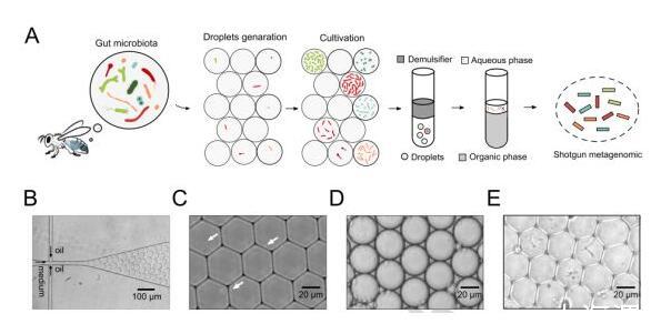 ▲圖丨微流控液滴中蜜蜂腸道細(xì)菌的單細(xì)胞封裝和培養(yǎng)(來(lái)源:研究論文)