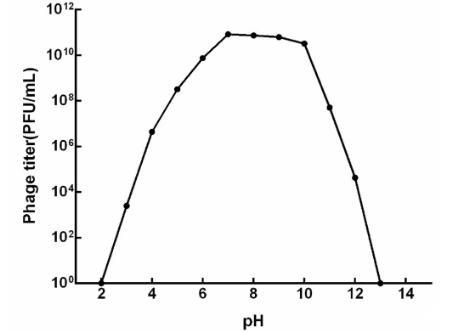 在不同pH條件下培養(yǎng)1 h后,噬菌體在pH6.0~10.0范圍能保持較高的活性,噬菌體滴度沒有明顯變化,且在pH為7時,噬菌體效價最高。隨著pH值的升高或降低,噬菌體的滴度下降明顯,在pH為2和13時,噬菌體完全失活(圖6)。該結果表明該噬菌體能耐受弱酸和弱堿條件,具有較好的酸堿耐受性。