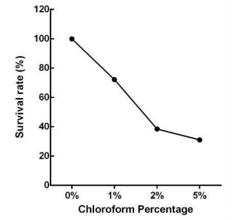 將噬菌體JA2與分別與含1%,2%,5%氯仿的LB培養(yǎng)基混合,處理30 min后通過雙層瓊脂平板法檢測噬菌體效價。結果顯示,氯仿對噬菌體的滴度有較為明顯的影響,隨著氯仿濃度升高,噬菌體存活率相應降低(圖7),提示該噬菌體對氯仿敏感。