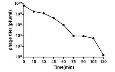 噬菌體經紫外照射后,按15 min為時間間隔取樣,噬菌體滴度急劇下降,隨著照射時間延長,噬菌體滴度下降幅度平緩(圖8),表明該噬菌體對紫外線較為敏感,但也具有一定的抵抗能力。