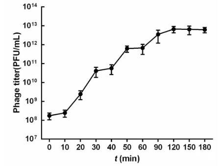 如圖4所示,噬菌體JA2感染宿主菌后10 min內噬菌體滴度沒有明顯變化,表明其潛伏期約為10 min,感染后20~60 min內噬菌體的滴度明顯上升,之后趨于穩(wěn)定,表明噬菌體裂解期約為60 min。根據(jù)裂解量(Burst Size)=爆發(fā)末期噬菌體效價(PFU/ml)/感染初期宿主菌濃度(CFU/mL)計算,噬菌體裂解量約為117 PFU/Cell,表明該噬菌體具有極強的裂解和復制能力。