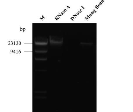 經DNase I、RNase A和Mung Bean Nuclease處理后,將噬菌體基因組進行核酸電泳鑒定,結果顯示,噬菌體JA2的基因組能被DNase I完全降解,而用RNase A處理不降解,表明其基因組核酸為DNA(圖3)。同時Mung Bean Nuclease處理亦無法降解,表明該噬菌體基因組為雙鏈DNA(dsDNA)。
