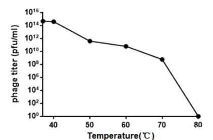 噬菌體JA2在40~80℃水浴中分別作用30 min后的效價變化情況如圖5所示??梢园l(fā)現(xiàn),隨著溫度升高,噬菌體效價開始明顯下降,溫度到達80℃時噬菌體基本失活。表明該噬菌體具有一定的耐熱性,但高溫容易引起其失活。