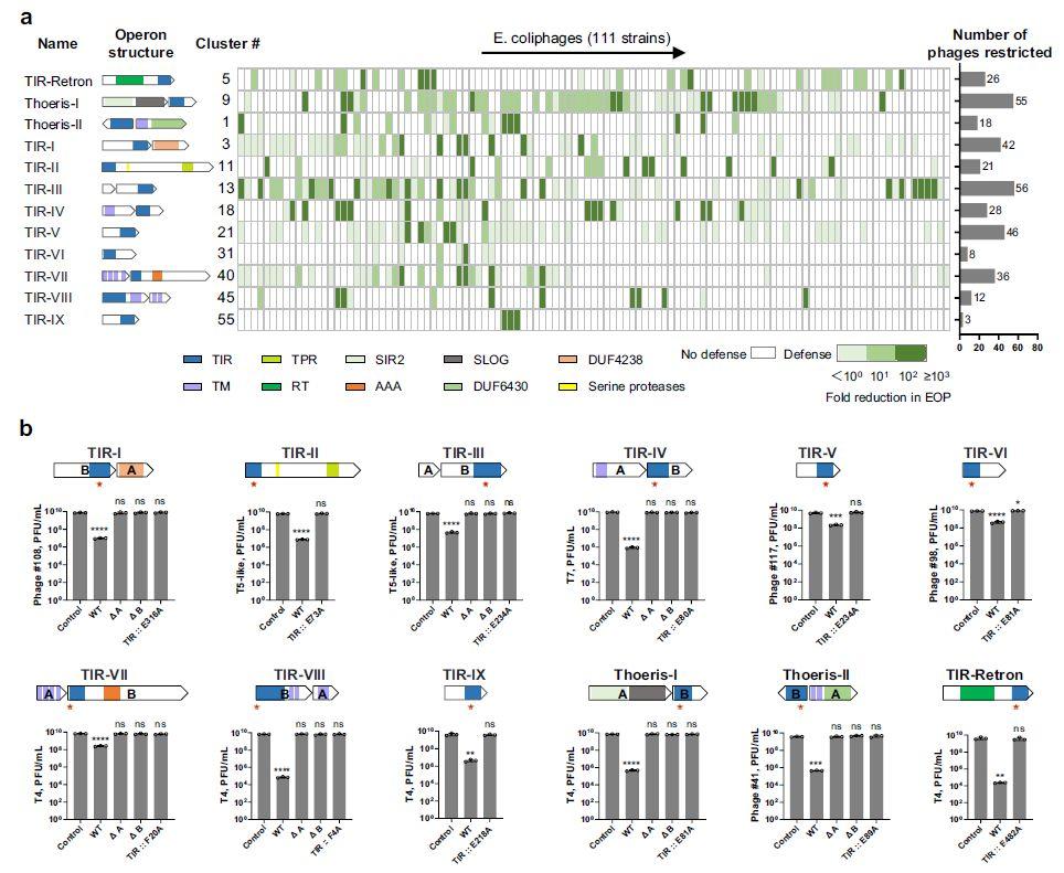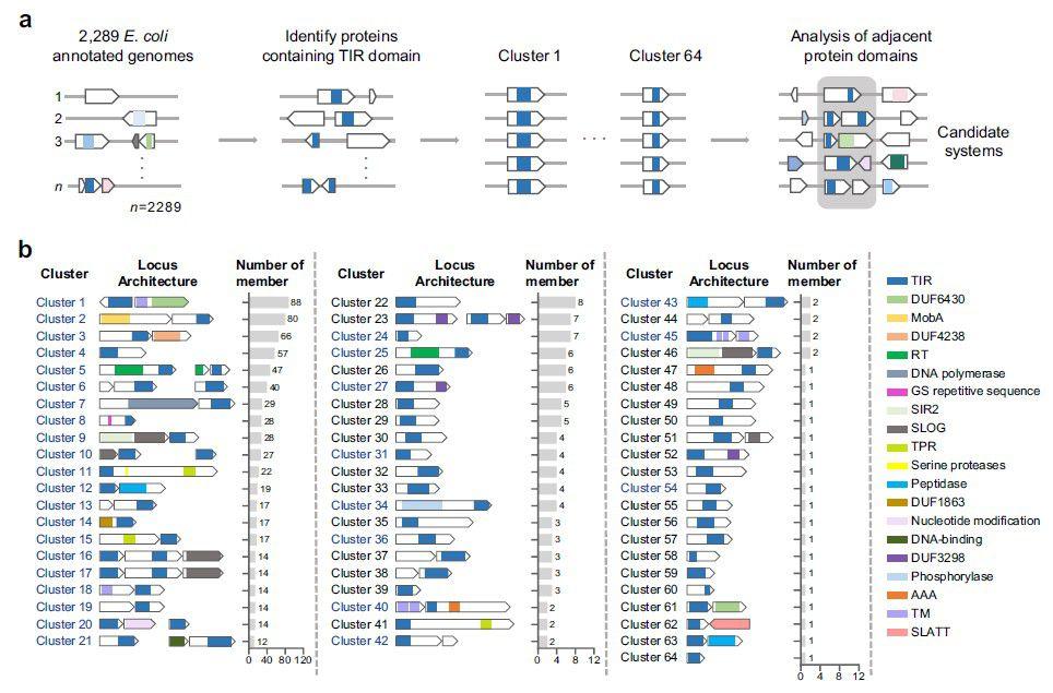 圖1、篩選包含TIR結(jié)構(gòu)域的候選抗噬菌體防御系統(tǒng)。a)用于從NCBI數(shù)據(jù)庫中提供的所有大腸桿菌基因組中識別包含TIR域的候選系統(tǒng)的流程圖。b)64個TIR候選防御系統(tǒng)的軌跡架構(gòu)。條形圖顯示了已測序的大腸桿菌基因組中每個簇的成員。以藍色突出顯示的集群表示本研究中克隆的32個TIR系統(tǒng)。結(jié)構(gòu)域:RT逆轉(zhuǎn)錄酶、功能未知的DUF結(jié)構(gòu)域、TPR四肽重復(fù)序列、TM跨膜。