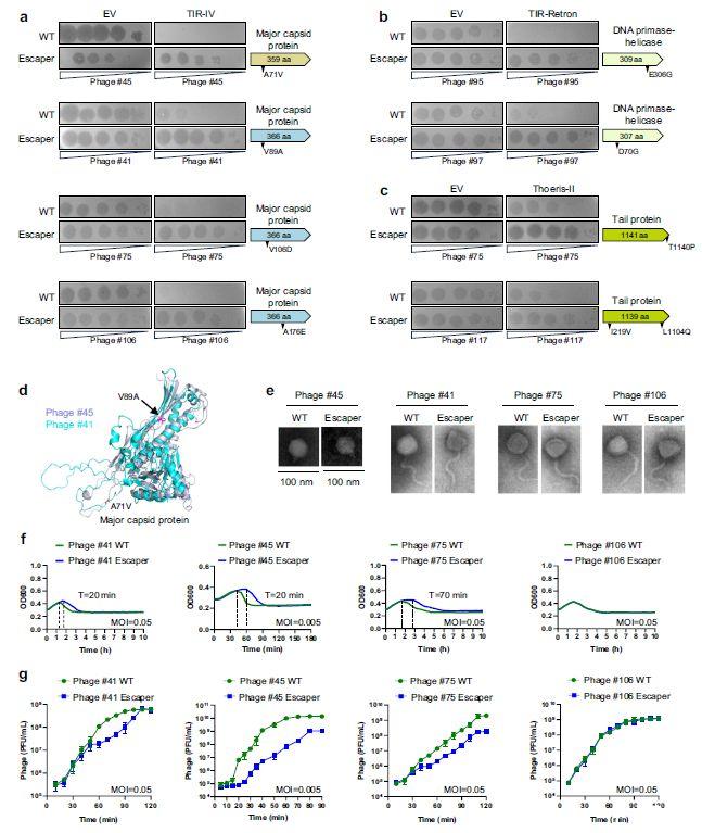 圖4、單個TIR防御系統(tǒng)可能對不同噬菌體的相同成分敏感。a–c噬菌斑測定表明,TIR-IV(a)、TIR-Retron(b)和Thoeris-II(c)系統(tǒng)分別對不同噬菌體的主要衣殼蛋白、DNA引物酶解旋酶和尾部蛋白敏感。缺乏TIR系統(tǒng)的空載體用作陰性對照。使用十倍系列稀釋的噬菌體進行感染。蛋白質(zhì)中的突變位點用黑色箭頭表示。d噬菌體#41和#45主要衣殼蛋白的結(jié)構(gòu)分析。使用AlphaFold2對結(jié)構(gòu)進行建模并使用PyMOL進行分析。突變位點以紅色突出顯示。e純化的WT和逃逸的噬菌體病毒粒子的電子顯微照片。測定一式三份進行并顯示了代表性結(jié)果。f)表達滅活TIR-IV突變體的大腸桿菌MG1655上的WT(綠線)和逃逸噬菌體(藍線)#45、#41、#75和#106的感染動力學。g)WT和逃逸噬菌體#45、#41、#75和#106在大腸桿菌MG1655上的一步生長曲線。