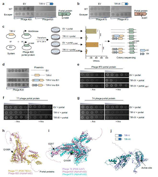 圖5、不同的TIR防御系統(tǒng)可能對不同噬菌體的相同成分敏感。a、b噬斑測定表明TIR-V(a)和TIR-IX(b)系統(tǒng)分別對噬菌體#20和#70的門蛋白敏感。缺乏TIR系統(tǒng)的空載體用作陰性對照。使用十倍系列稀釋的噬菌體進行感染。蛋白質(zhì)中的突變位點用黑色箭頭表示。c)該圖顯示TIR-V和門蛋白表達質(zhì)粒的共轉(zhuǎn)化導致轉(zhuǎn)座酶S1/S4插入破壞TIR-V系統(tǒng)。直方圖顯示,在TIR-V系統(tǒng)存在下,門蛋白表達質(zhì)粒的轉(zhuǎn)化效率顯著降低。數(shù)據(jù)以三個生物重復(fù)的平均值表示。d)噬菌斑測定表明,TIR-V的抗噬菌體活性被轉(zhuǎn)座酶S1/S4插入消除。e)在TIR-IX系統(tǒng)存在下,噬菌體#70的WT門蛋白的毒性。f,g)T7噬菌體門戶蛋白可以激活TIR-V,但不能激活TIR-IX系統(tǒng)(f),而T4噬菌體門戶蛋白可以激活兩者(g)。h,i噬菌體T7(深黃色)、#20(紫色)、T4(淡紫色)和#70(青色)的門戶蛋白的結(jié)構(gòu)分析。j)TIR-V和TIR-IX蛋白的結(jié)構(gòu)和保守性分析。