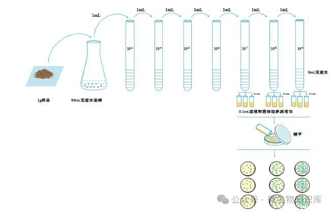 (2)標(biāo)記:將事先制備好的無菌平板上標(biāo)記10-7、10-8、10-9,每一個梯度稀釋設(shè)置三個重復(fù)。