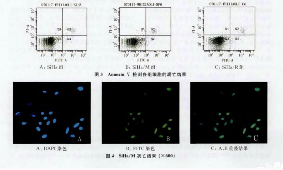 本研究采用Annexin V聯(lián)合PI法和TUNEL 2種方法測定轉(zhuǎn)染細(xì)胞的凋亡情況。2種方法分別檢測凋亡發(fā)生的不同時相,反映誘發(fā)凋亡的不同機(jī)制。采用AnnexinⅤ檢測方法觀察細(xì)胞凋亡,發(fā)現(xiàn)3組細(xì)胞凋亡指數(shù)無明顯差別;采用TUNEL染色,結(jié)果顯示SiHa/M、SiHa/R組凋亡細(xì)胞發(fā)生率較高,與對照組相比差異有統(tǒng)計學(xué)意義;SiHa/M組與SiHa/R組比較,SiHa/M組凋亡發(fā)生率高于SiHa/R組。