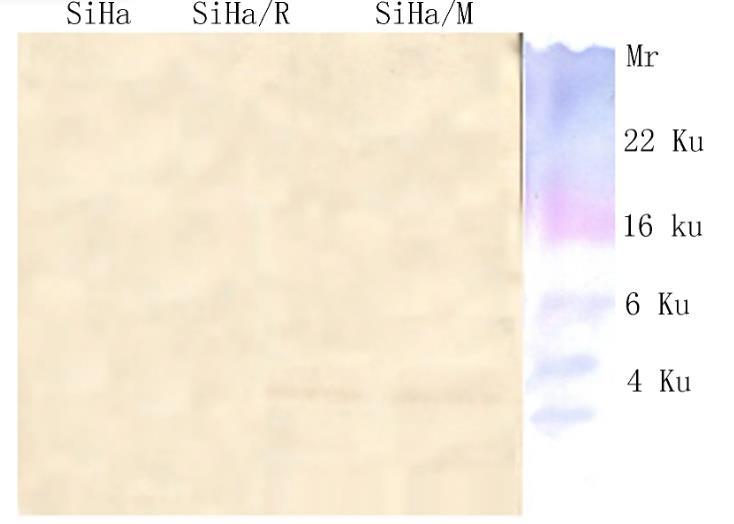 2.1細(xì)胞裂解上清Westernblot分析結(jié)果顯示,SiHa/M、SiHa/R組在4~6 Ku區(qū)域出現(xiàn)目的條帶,而SiHa組無目的條帶(圖1)。