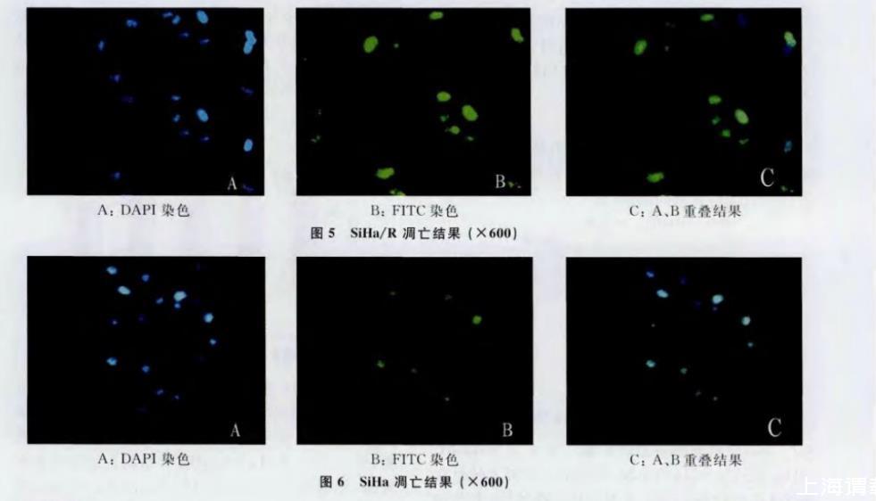 2.3.2 TUNEL檢測結(jié)果細(xì)胞大小形態(tài)不一,可見凋亡細(xì)胞胞核固縮濃染,核質(zhì)致密,出現(xiàn)核邊緣化,呈半月形;正常細(xì)胞胞核相對疏松,無核濃染現(xiàn)象(圖4~6)。SiHa/M、SiHa/R組凋亡細(xì)胞發(fā)生率較高,分別為(40.6±4.67)%、(30.2±3.19)%,而SiHa組只有(7.4±1.94)%,SiHa/M、SiHa/R組凋亡細(xì)胞發(fā)生率明顯高于SiHa組,差異有統(tǒng)計學(xué)意義(P=0.004);SiHa/M組與SiHa/R組比較,SiHa/M組凋亡發(fā)生率高于SiHa/R組,差異有統(tǒng)計學(xué)意義(P=0.003)。